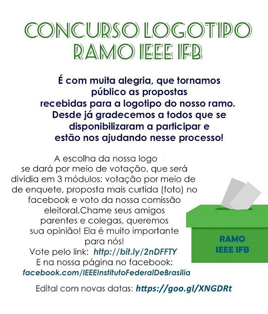 É com muita alegria, que o Ramo Estudantil IEEE IFB torna público as propostas recebidas para o seu Logotipo . Pedimos perdão pela demora e desde já agradecemos a todos que se disponibilizaram a participar e estão nos ajudando nesse processo!