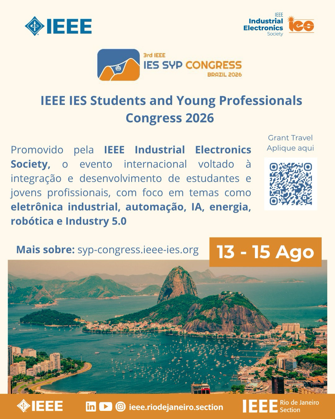 A IEEE anuncia que o IEEE IES Students and Young Professionals (SYP) Congress 2026 será realizado pela primeira vez no Brasil, na cidade do Rio de Janeiro, entre os dias 13 e 15 de agosto de 2026.