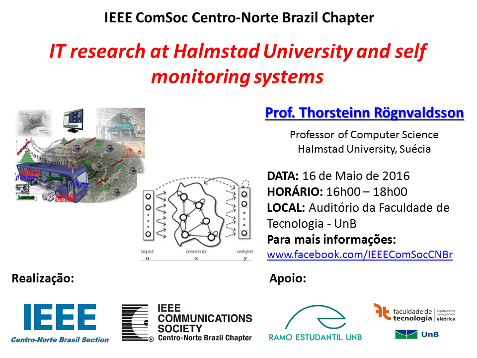 Em parceria com Seção Centro-Norte Brasil do IEEE e com apoio do Departamento de Engenharia Elétrica da Faculdade de Tecnologia da Universidade de Brasília, o Capítulo Profissional da IEEE Communications Society da Seção Centro-Norte Brasil (www.facebook.com/IEEEComSocCNBr) tem o prazer de anunciar a Palestra: “IT research at Halmstad University and self monitoring systems“.