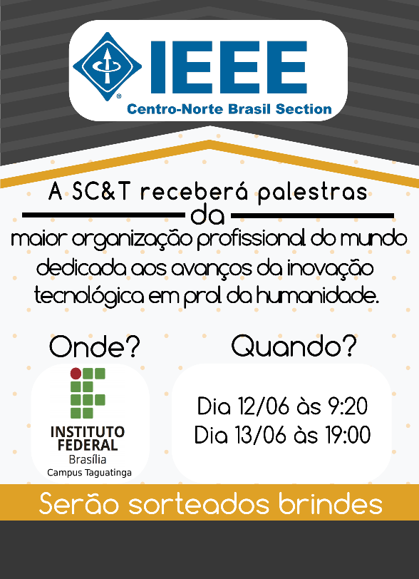 Dentre as palestras programadas, duas delas serão ministradas por voluntários do Ramo Estudantil IEEE UnB da Seção Centro-Norte Brasil visando explicar um pouco sobre o IEEE, benefícios aos seus membros, além de promover a abertura de um Ramo Estudantil no próprio IFB Campus Taguatinga. Membresias estudantis serão sorteadas aos que estiverem no evento.
