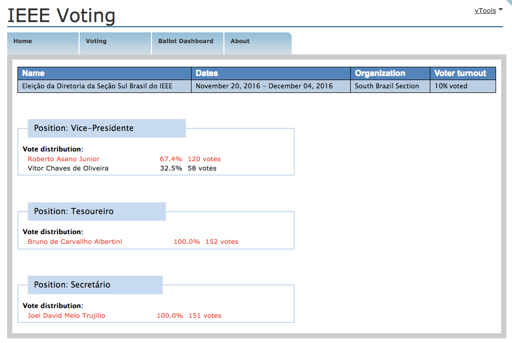 Vejam no anexo o printscreen do Vtools com o resultado da Eleição para a próxima Diretoria da Seção.